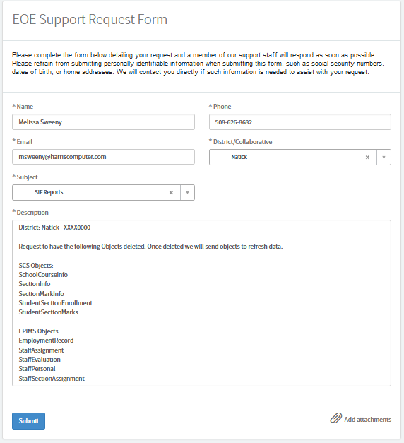 Example SIF Help Desk ticket request to clear out SCS and EPIMS Objects after Add/Drop Period: District: (District Name) – (District ID#) Request to have the following Objects deleted. Once deleted we will send objects to refresh data. SCS Objects